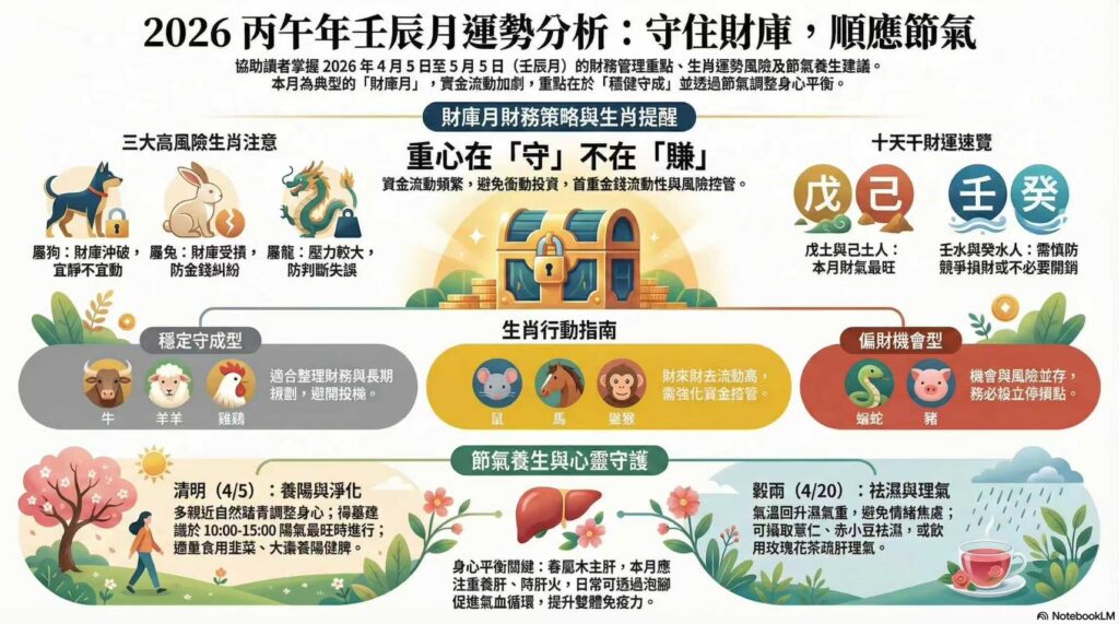 本月壬辰為財庫之月,財氣啟動、資金流動加劇,對十二生肖而言,各有不同的財務課題與能量變化。此月重點不在「賺多少」,而在「守不守得住」,以下為各生肖重點提醒: