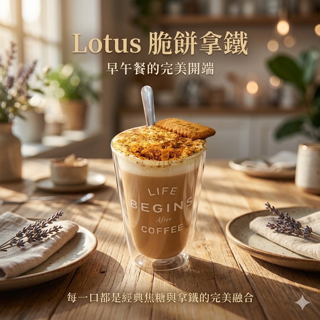 如果偏好甜感系咖啡,店內另一款高人氣品項則是 Lotus 脆餅拿鐵。游正宇表示,這款咖啡將 Lotus 醬與咖啡融合,上層再灑上黑糖,增添香氣與層次感,整體風味偏甜,因此特別受到不少女性客人喜愛;飲品還會附上一塊 Lotus 蓮花焦糖脆餅,讓整體搭配更完整,也更具記憶點。