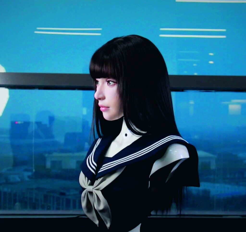 鏡頭裡,一名擁有白皙膚色、立體五官的人臉機器人靜靜注視著鏡頭,時而微微垂眸,時而隨著攝影機移動目光,面部神情自然細膩,甚至連嘴角上揚的弧度都帶著近乎真實的人味。