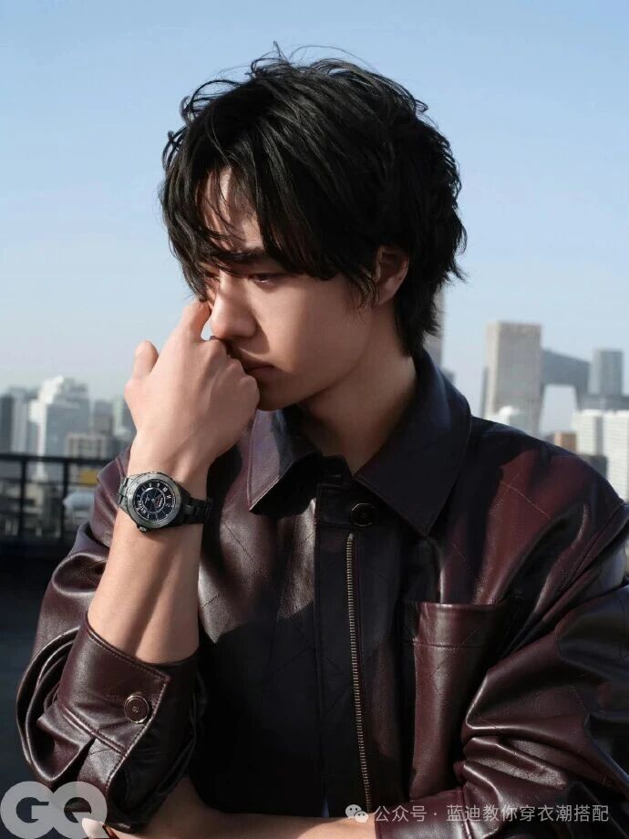 此次雙封面造型各具特色,精準呈現 CHANEL 男裝在俐落剪裁與高級質感上的層次變化。主封面中,王一博身穿酒紅色亮面皮革夾克,搭配簡約白色內搭,透過深淺對比勾勒出鮮明輪廓。皮革材質自帶冷冽鋒芒,在他沉著鬆弛的神態中,多了幾分克制而內斂的矜貴氣場。腕間佩戴的 CHANEL J12 腕表則成為整體造型亮點,以黑白經典設計呼應服裝基調,也進一步提升畫面的高級感與完整度。