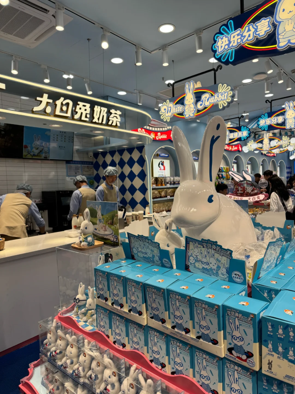 此次奶茶首店開業,也不只是單純賣飲品。店內同步設有大白兔IP周邊商品區,販售毛絨玩偶、盲盒、掛件等潮玩產品。開業當天,大白兔玩偶也現身門店與消費者互動,進一步強化品牌IP的親和力與社群話題性。