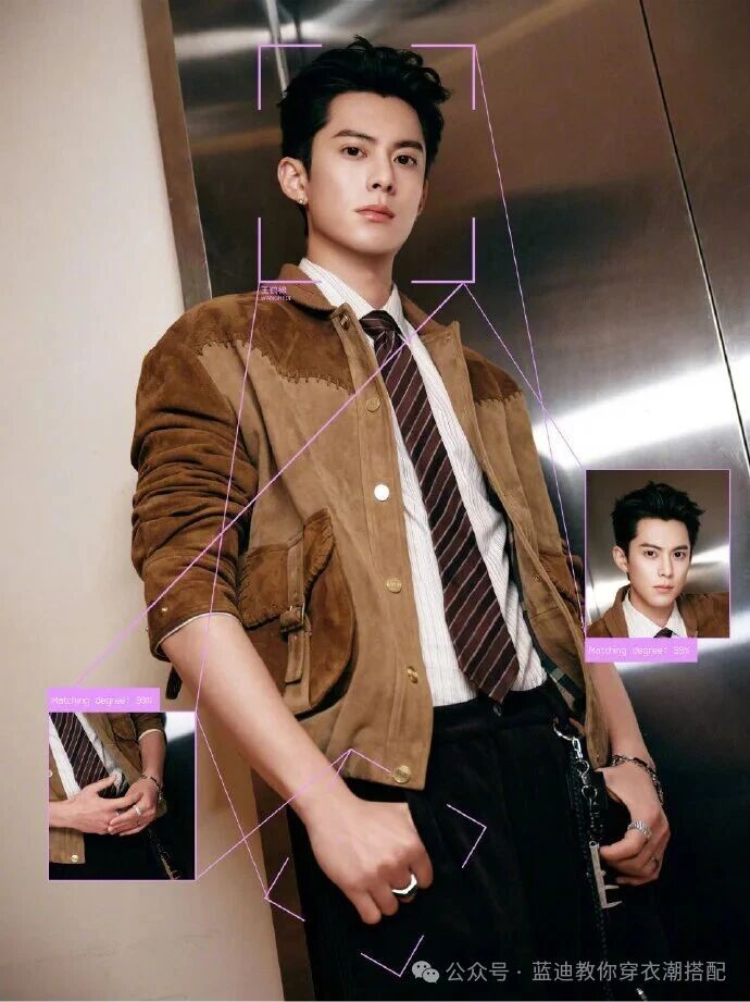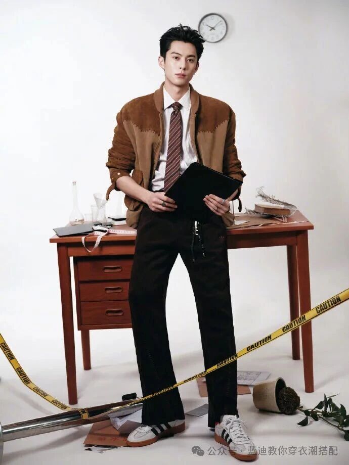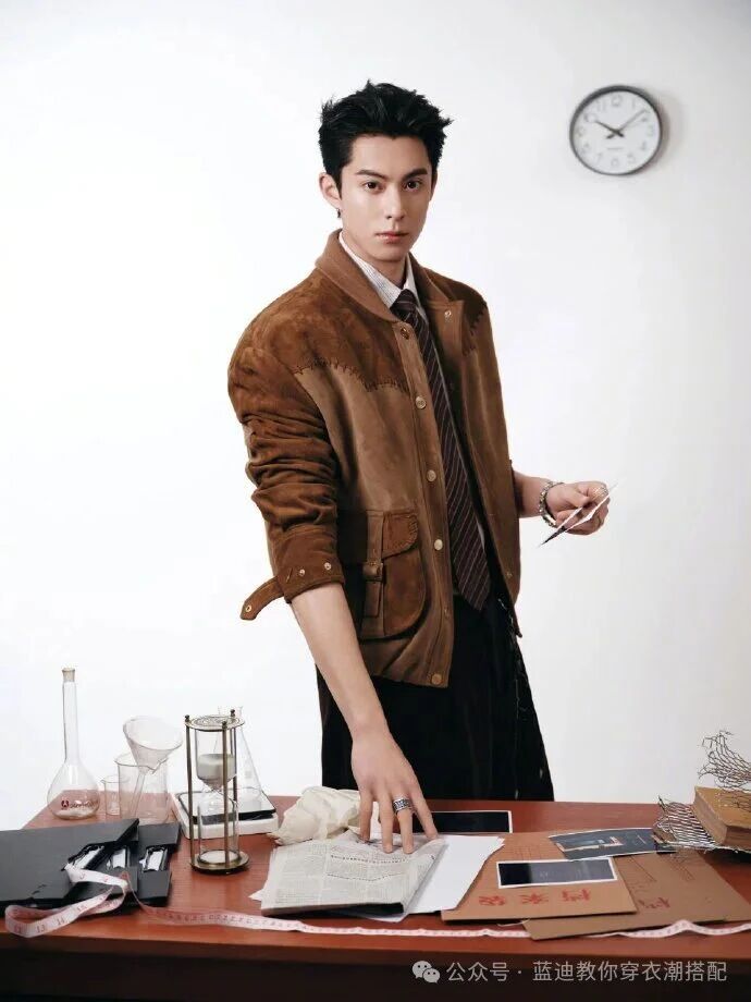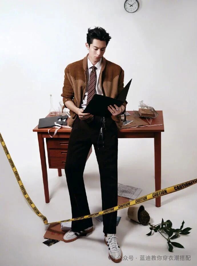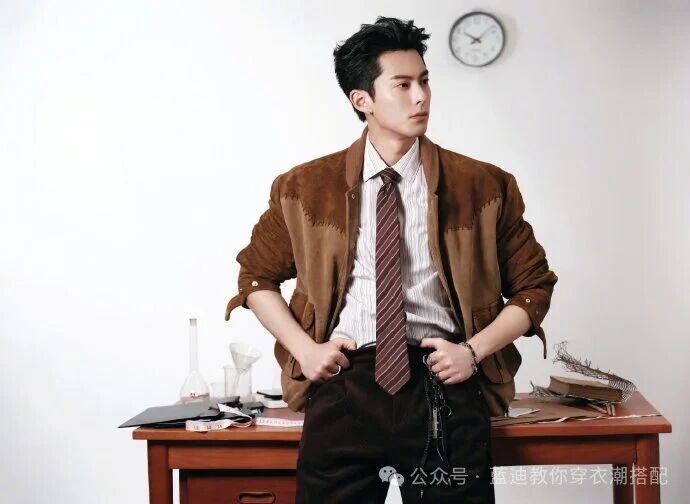 從時尚角度來看,王鶴棣此次造型並未依賴強烈造型堆疊,而是透過材質、剪裁、色彩與場景完成整體氛圍建構。焦糖棕麂皮的復古感、手工編織皮繩的設計感、白襯衫領帶的職業感,以及背頭妝髮帶出的冷峻氣質,共同組成一套完整的人物形象。它不是單純的「好看」,而是讓穿搭為角色服務,讓時尚成為戲劇敘事的一部分。