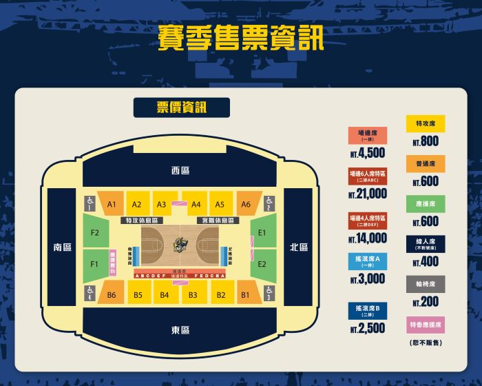 票價方面,一樓場邊席第一排4,500元,第二排場邊特區6人席一組21,000元、場邊特區4人席一組14,000,籃下搖滾席第一排3,000元、第二排2,500元;二樓部分,特攻席800元、普通席和應援席皆為600元;三樓全區皆為400元,採自由入座。