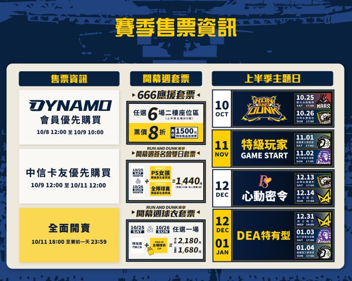 2025-2026賽季門票將於10/11(六)18:00全面開賣,「DYNAMO會員」及中信卡友一樣享有優先購票權利,10/8(三)12:00-10/9(四)10:00開放「DYNAMO會員」優先購買;10/9(四)12:00-10/11(六)12:00「中信卡友」優先購買。更多售票資訊與主題活動詳情,請持續關注中信特攻社群平台,掌握球隊最新資訊。