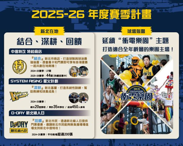中信特攻持續以創新和熱情打造最佳主場觀賽體驗,展望2025-2026賽季,中信特攻從球場氛圍升級與新北在地連結兩大面向,帶給球迷更多感動與參與感。新賽季特攻將延續深受好評的「衝電樂園」主題,不僅保留原有深受小朋友喜愛的氣墊遊樂設施,更規劃加入更多適合青少年與成年球迷的遊戲攤位,全面升級場外活動內容,讓大朋友、小朋友都能盡情同樂,打造真正適合全年齡層的主場派對。