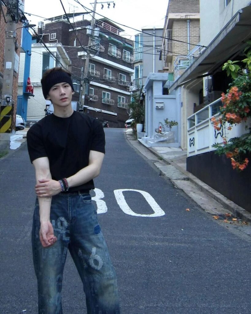 黑色短袖T恤搭配自家品牌 GOODBAI 的寬版牛仔褲,舒適又有街頭感,輕鬆展現不經意的時尚。