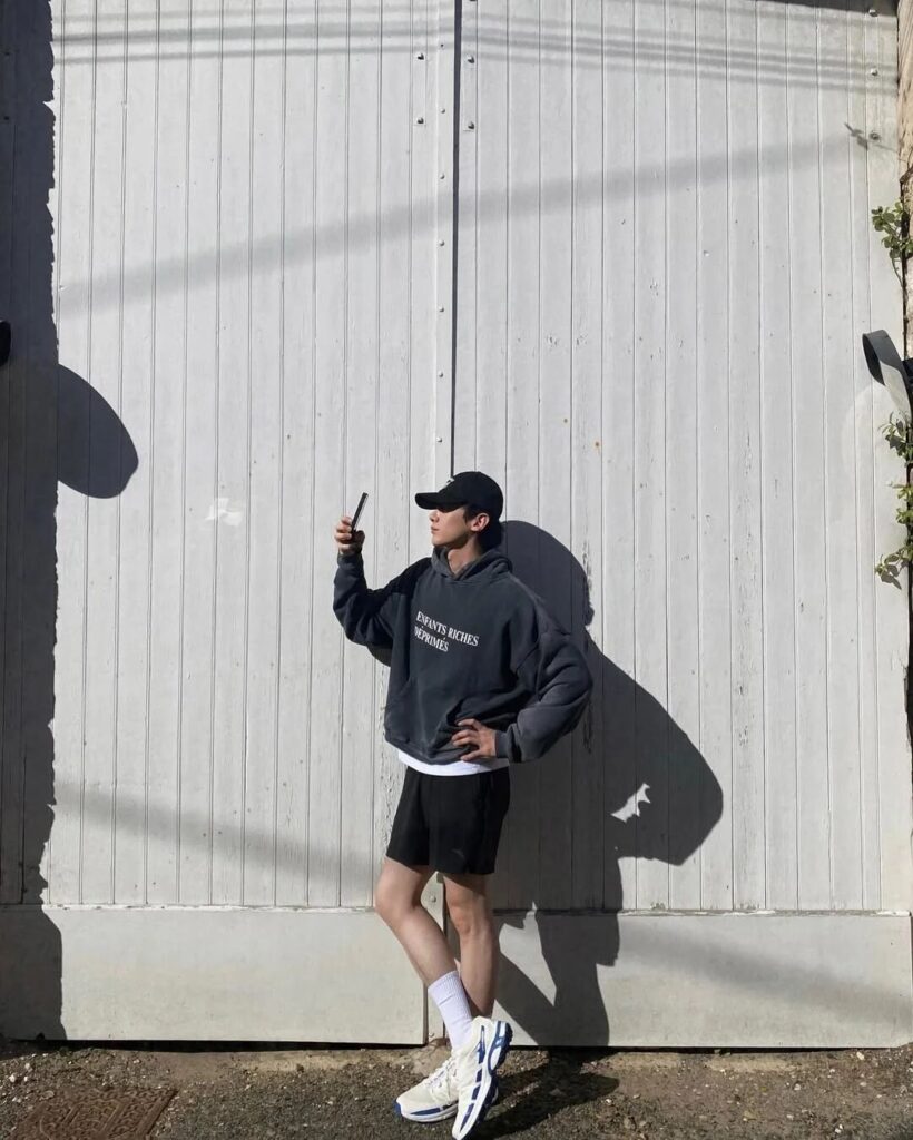 白敬亭以連帽T、運動短褲與Salomon運動鞋打造充滿動感的造型,青春氣息與運動時尚並存。