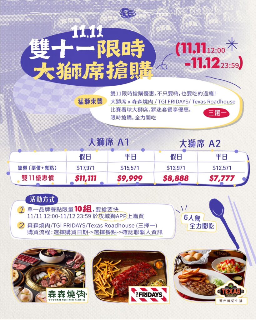 新竹御嵿攻城獅將於11月15日與11月16日下午兩點三十分在主場分別迎戰新北中信特攻、高雄全家海神。球團也在本週推出「大獅席場邊包廂雙11限定活動」,獅紫軍只要在11月12日晚上11點59分前內訂購本週末賽事大獅席,套票將包含Texas Roadhouse/Fridays/森森燒肉六人份套餐。套餐數量有限,請至攻城獅官方APP搶購。另外,目前本週末預售票已售出超過8000張,歡迎獅紫軍持續至攻城獅官方APP或拓元售票系統購票入場。