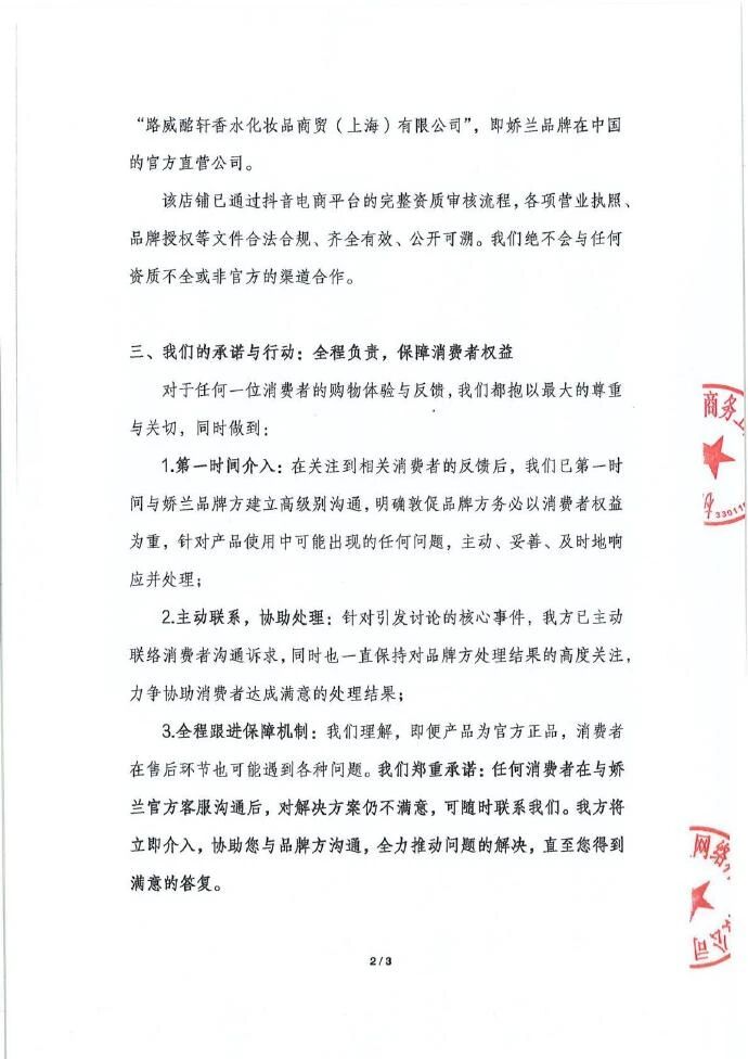 嬌蘭方面並稱已與消費者接觸,邀請其將商品寄回,以供進一步專項調查,並再次強調品牌一貫以品質與誠信為核心理念。
