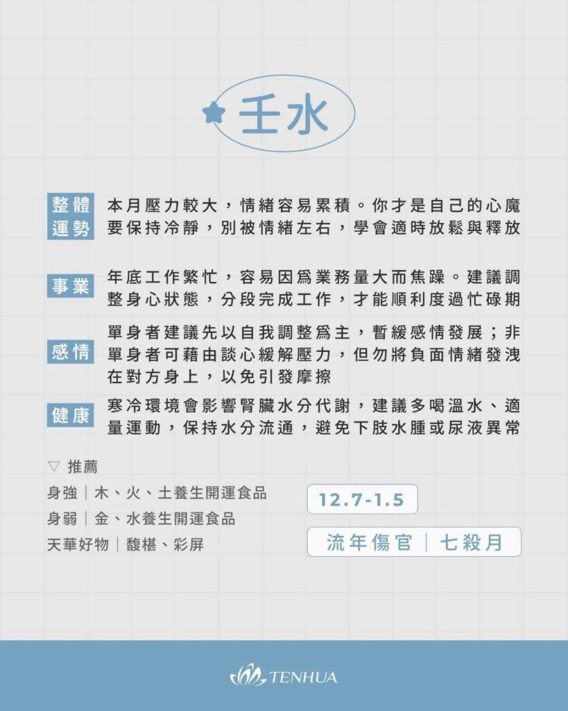 『壬水』:走《七殺》突然壓力  防意外、血光
