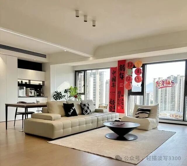 客廳則以原木茶几、圍合式沙發與水墨畫裝飾為主,未配置大型電視,整體風格融合中式與日式元素。桌面可見鮮花、兒童繪本及手寫筆記,凸顯家庭互動為空間主軸。