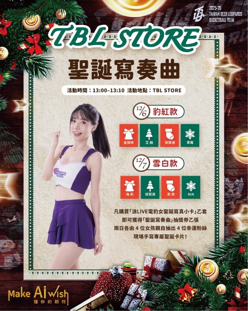 永豐銀行打造的「Make Ai Wish」主題週活動內容豐富,桃園巨蛋也將變身結合金融科技與節慶氛圍的聖誕主場。中場遊戲祭出「超人氣電玩主機組」大獎,場館環廊也將展示永豐 iWish、AI 防詐、智慧帳本等科技服務。「浪LIVE電豹女」將以聖誕造型現身與球迷互動,TBL STORE 也同步推出包括「Leopards 球衣零錢包」、「調啤豹玩偶」與「浪LIVE 電豹女聖誕寫真小卡」等多款新品。賽前官方 IG 直播「聖誕寫奏曲」活動中,女孩們更將親筆手寫聖誕卡片贈送幸運粉絲。