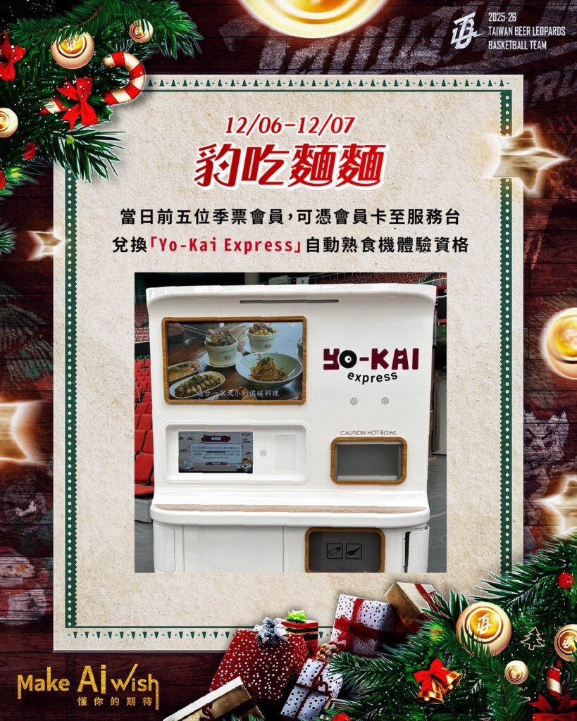 此外,本週主場新增亮點包括「Yo-Kai Express」自動熟食機,包廂區球迷可在觀賽同時享用熱騰騰拉麵;當日前五名季票會員還能憑會員卡至服務台兌換拉麵體驗資格。「攜手豹青頑張登場」活動也同步進行,只要穿著任何聖誕元素或雲豹相關服飾入場,就有機會與心儀的球星一起踏上主場舞台。