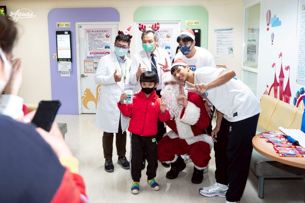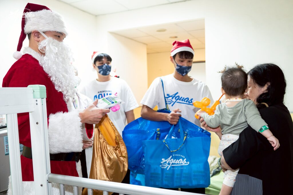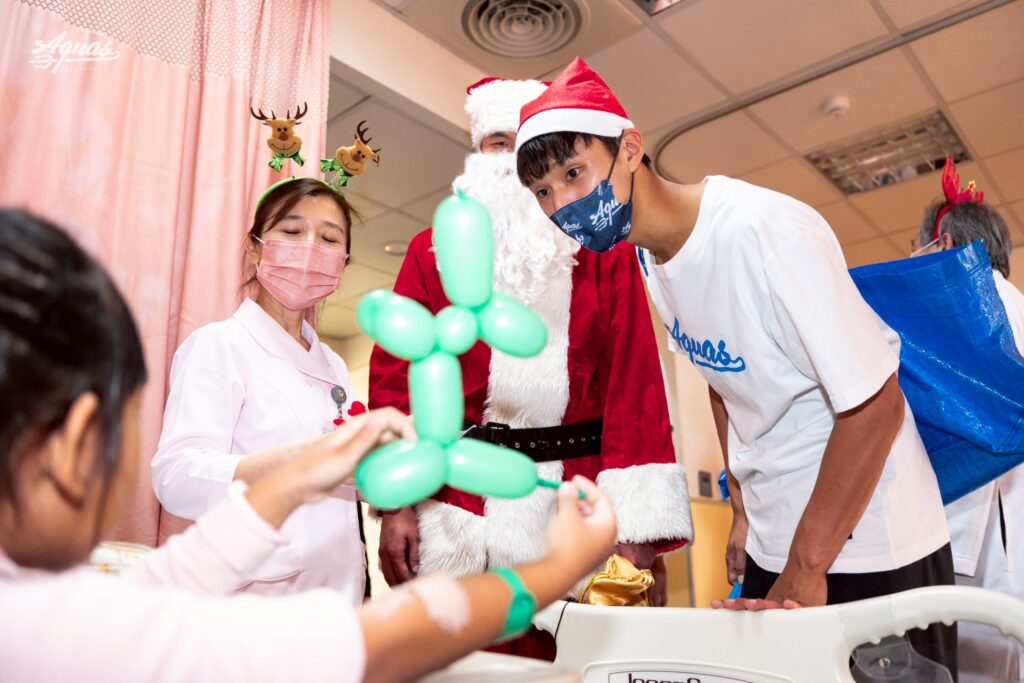 高雄全家海神職業籃球隊勤明慶、蘇文儒、廖偉皓24日浪愛延續做公益,化身聖誕老人前進高雄醫學大學附設中和紀念醫院(下稱:高醫),探訪兒科病房贈送禮物,並在兒科部門診等候區現場折造型氣球給前來看診的病童,緩和孩子們緊繃的看診情緒,在聖誕節前夕帶來溫暖與關懷。