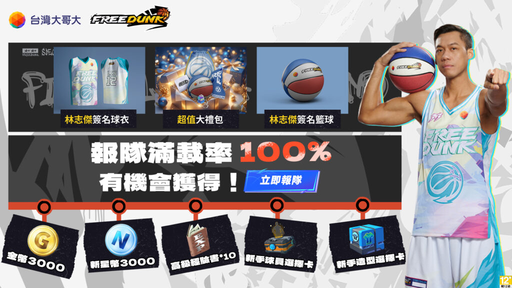 為迎接遊戲上市,《FreeDunk》同步推出預註冊「報隊集氣」活動。玩家於指定期間完成報隊任務,即可推進全服累積進度,並依達成率解鎖多項好禮,包括限量林志傑親筆簽名球衣、簽名籃球,以及遊戲金幣3,000元、新手球員選擇卡、高級經驗書等豐富虛寶,號召玩家提前集結,迎接街頭開戰時刻。