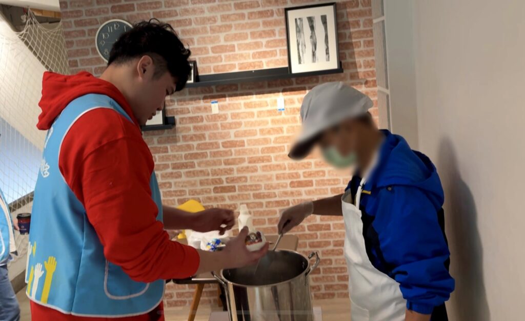 「長安浴寓」為無家者提供沐浴與衛生教育空間,並結合就業輔導、工作培力與心理支持,一樓義賣區則透過物資義賣維持機構運作。於手作課程中,陳冠全、孫思堯與街友從原料調配、攪拌到貼上瓶身標籤,一起完成洗衣精製作,成品使用天然成分與精油調製,為機構的義賣商品。