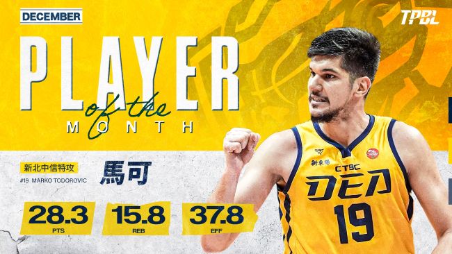 TPBL 例行賽 12 月賽程已結束,新北中信特攻在歲末階段展現穩定戰力,官方於今日(8日)公布 12 月個人獎項。特攻本土後場核心謝亞軒獲選 12 月 MVP,洋將中鋒馬可(Marko Todorović)則拿下 12 月最佳外援,兩人 12 月全勤出賽,攜手率隊打出 5 勝 1 敗的亮眼成績,成為球隊衝刺戰績的重要關鍵。