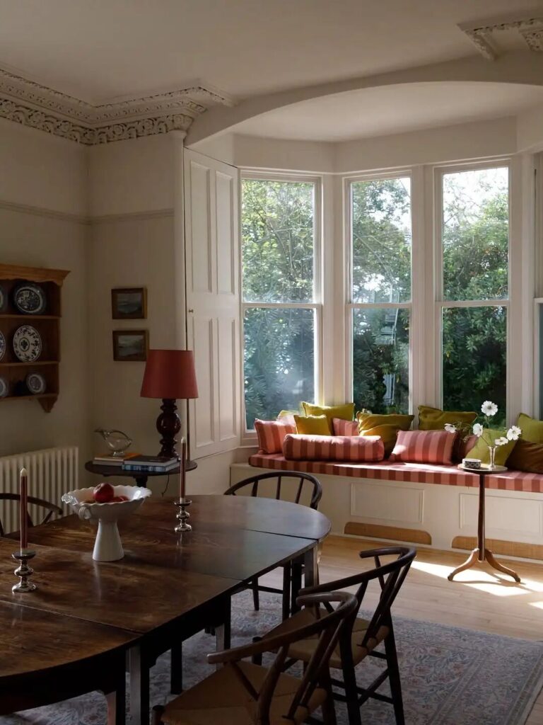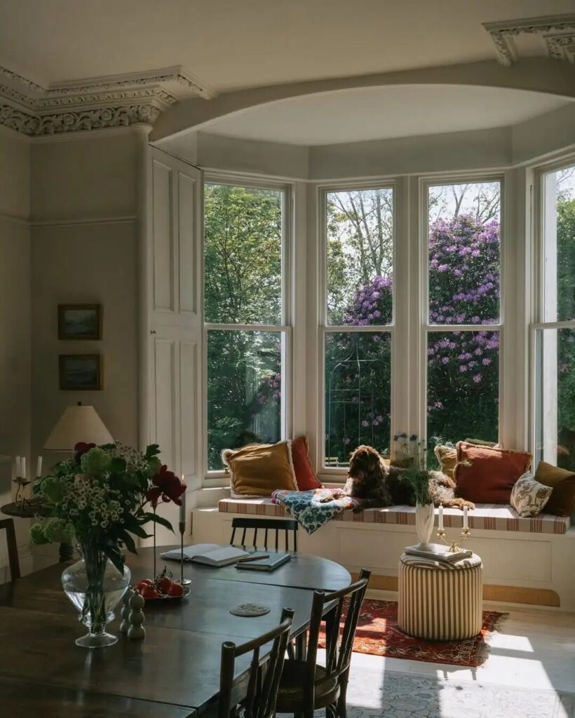 客廳融合復古優雅與現代舒適的元素,英倫風格明顯:古典建築細節與溫暖軟裝相得益彰,大尺寸凸窗讓陽光自然傾瀉,窗外茂密綠植宛如動態畫框,將室內外景觀完美連結。靠窗卡座設計,不僅善用空間,更營造出舒適的閱讀角或休憩小天地。