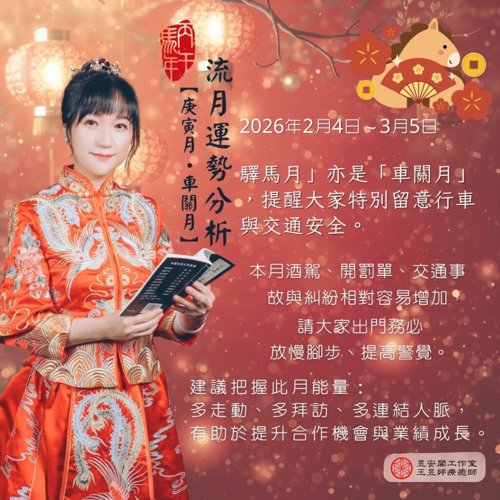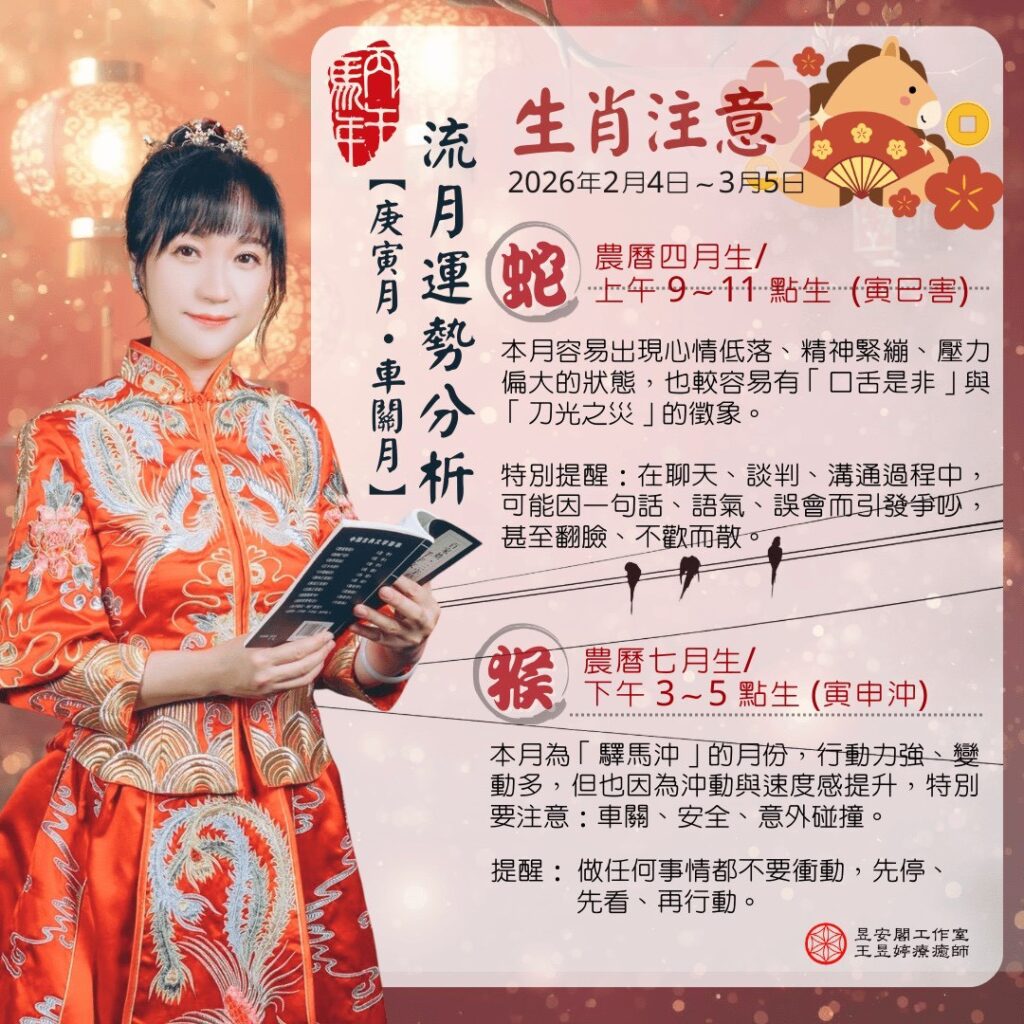 本月為「驛馬沖」的月份,行動力強、變動多,但也因為沖動與速度感提升,特別要注意:車關、安全、意外碰撞。