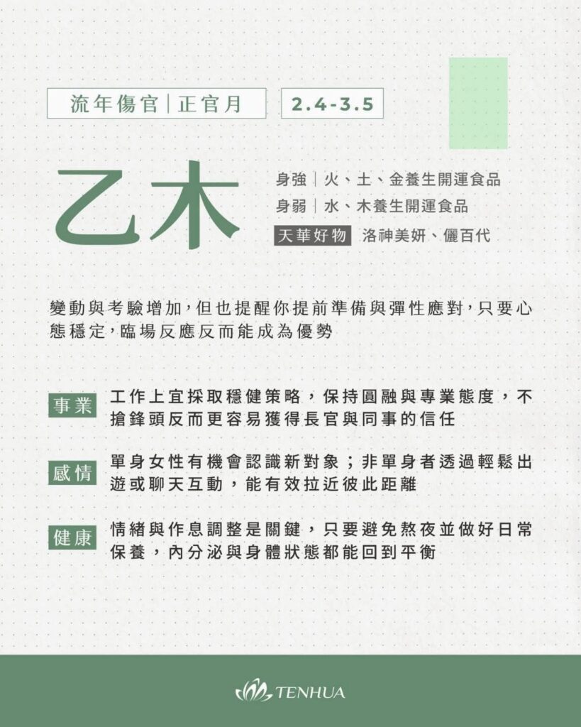 這個月乙木走到「正官月」,你的氣場會更穩、更有份量。你說出口的話更容易被聽見,也更容易得到信任與支持。工作上有機會被看見、被肯定,甚至迎來升遷、加薪或重要任務的邀請。請好好把握這股能量,讓自己在對的時間站出來、發光發熱。