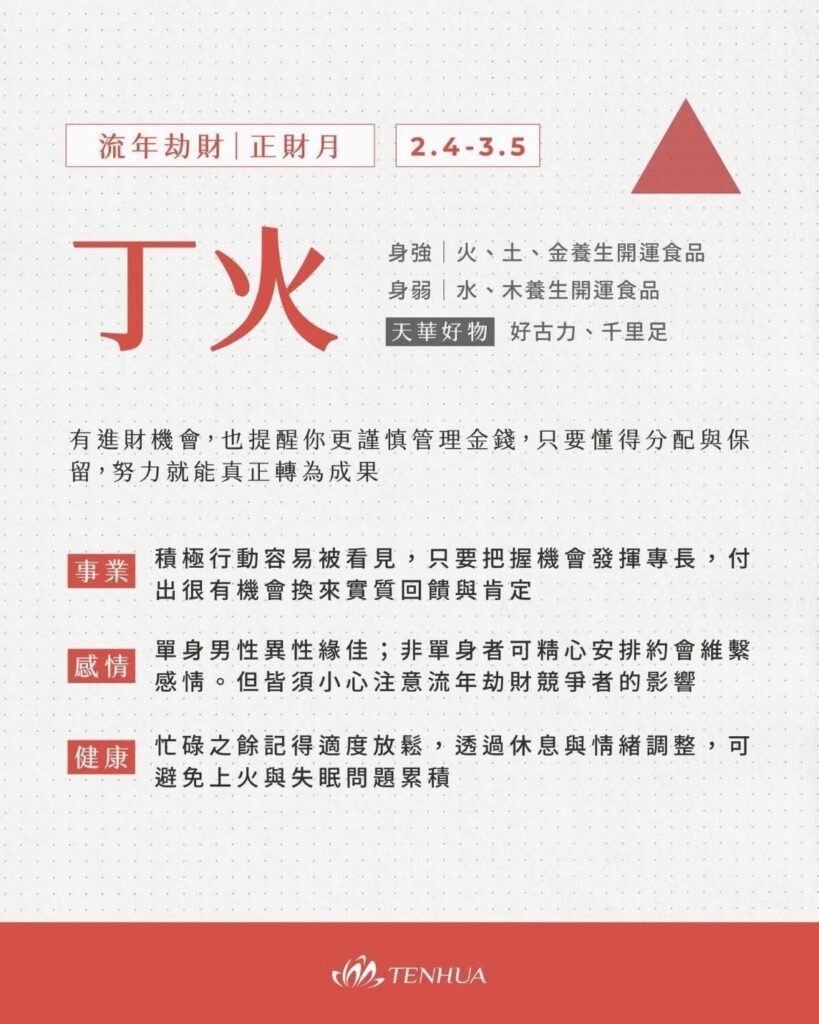 本月丁火走「正財」能量,不論男女皆有較佳的正財收入機會,適合靠專業、努力與穩定的方式累積財富。亦有出遊、聚會、玩樂等機會增加,整體心情較具歡喜心,人際互動也較容易順暢。