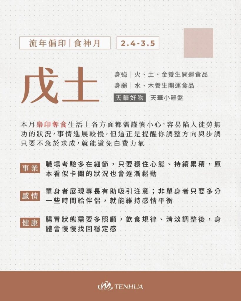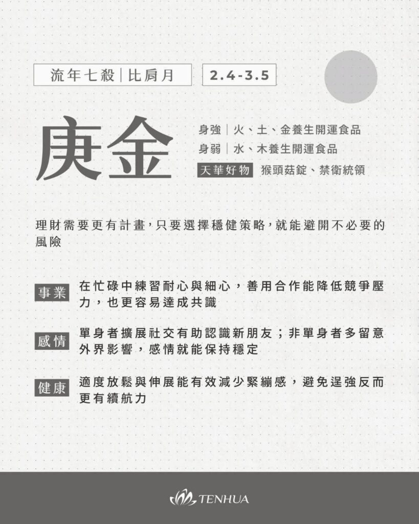 - 身弱命格者本月需留意破財或收支失衡之象,建議避免衝動消費與高風險投資;同時可透過作息規律、運動、能量補強等方式提升氣場與穩定度,讓財運更能守得住。