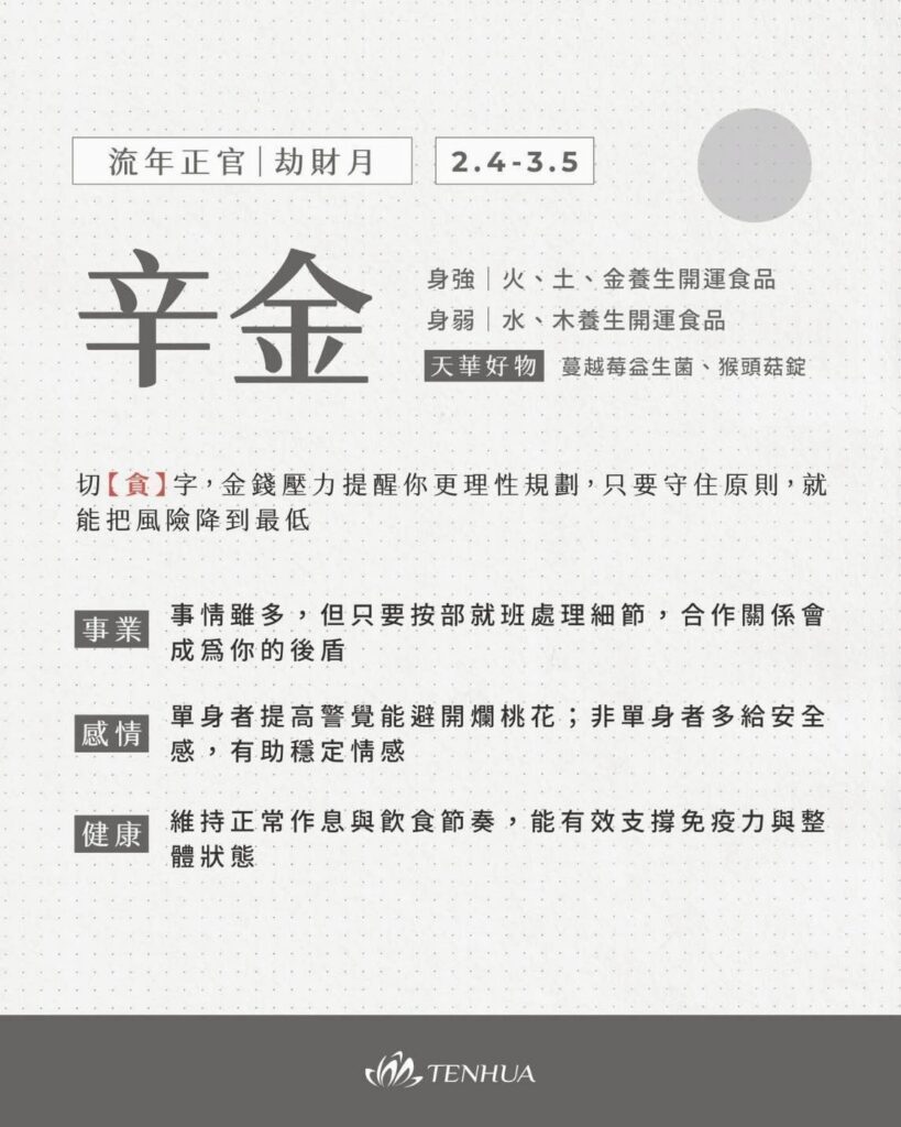 本月辛金走「劫財」能量,競爭者多為「明著來」,競爭壓力與資源爭奪感提升。此月需特別留意錢財、感情、健康與時間管理,並避免因衝動或疏忽造成額外的不必要開銷,使財務出現流失。