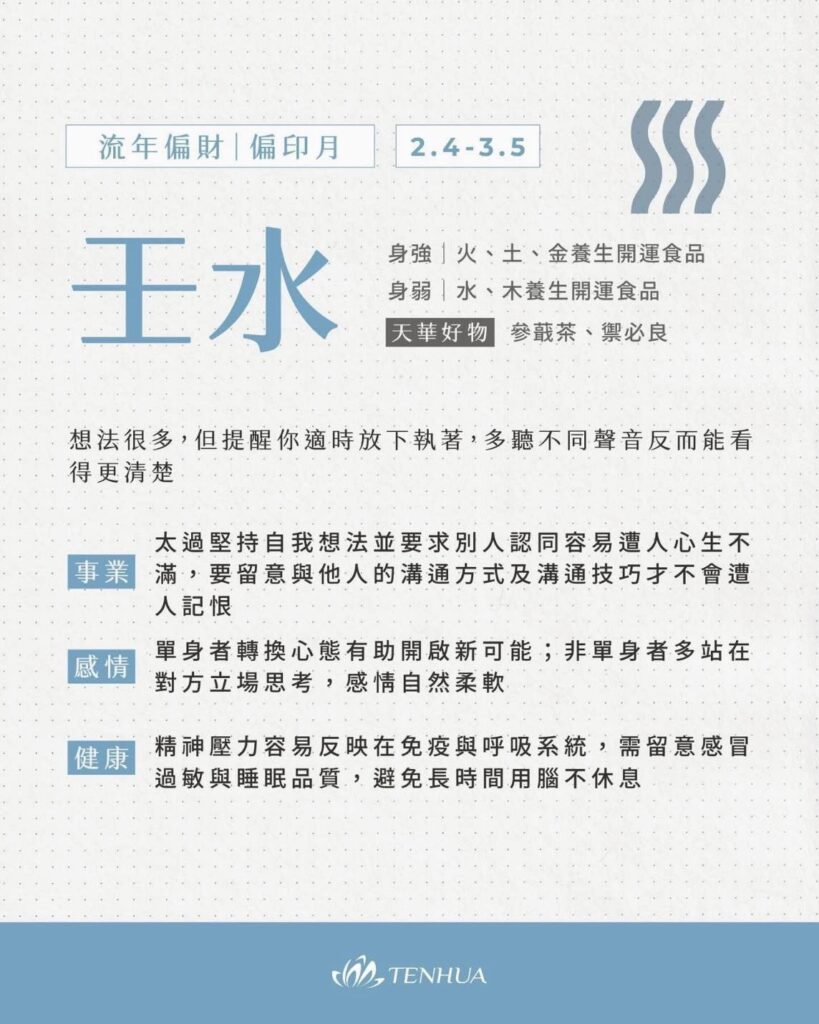 本月壬水走「偏印」能量,思考敏捷、靈感增加,容易冒出新奇點子與跳躍式想法,對學習、研究、創意發想有加分效果。然而偏印月也容易讓人「想太多、反應太快」,若表達方式不當,可能造成他人誤解。
