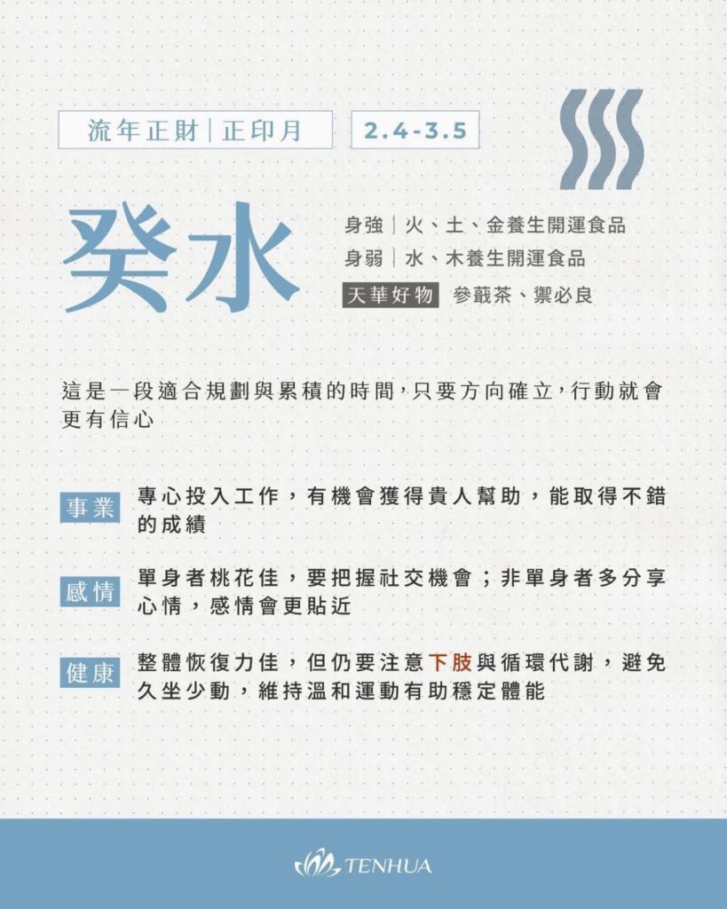 本月癸水走「正印」能量,貴人運明顯提升,整體做事較容易得到支持與助力,許多事情也會比以往更順心、更容易推進。請務必把握此月的好運勢,持續努力、積極行動,成果可期。